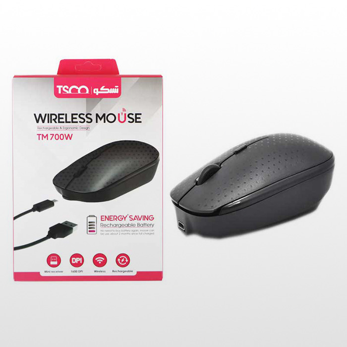 «TM 700W» يک ماوس بيسيم همراه با حسگر اپتيکال است که توسط کمپاني «تسکو» طراحي و توليد شده است. اين ماوس با دقتي برابر با 1600 نقطه در اينچ قادر است عملکرد مناسبي را به شما ارائه دهد، همچنين شما ميتوانيد متناسب با کاري که انجام ميدهيد و دقتي که براي انجام آن کار نياز داريد، با استفاده از دکمه تغيير ميزان DPI اين محصول ، دقت آن را در بازههاي 800 ، 1200 و 1600 جابجا کنيد. ماوس تسکو «TM 700W» داراي 4 کليد بوده و داراي باطري ليتيومي قابل شارژ با ظرفيت 400mAh بوده که با يک کابل MICRO USB در مدت زمان 1.5 تا 2 ساعت شارژ مي شود . همچنین يک دکمهي خاموش/روشن هم براي هرچه کمترشدن مصرف انرژي روي اين ماوس قرار داده است.